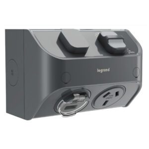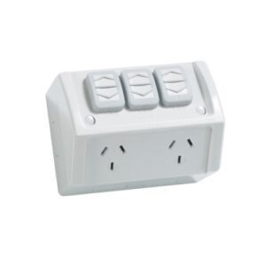 SKU: c3de58234615Twin Switch Socket Outlet, 250V, 10A, Weather Proof, Extra Switch – Resistant Grey
